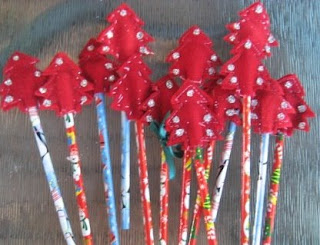 I was lucky enough to find these lovely Christmas pencils at the local $2 shop, then I cut lots of Christmas Trees out of felt (see One crafty Mumma's link for the pattern)